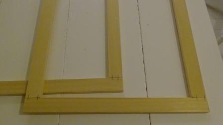 外枠をタッカー(大きなホチキスのようなもの)で留める。表側と裏側の両方をタッカー留めしてあります。