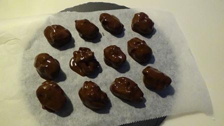湯せんで溶かしたチョコにフォンデュのようにくぐらせたら、キッチンペーパーの上に並べ冷蔵庫で冷やします。30分程度で固まりました。