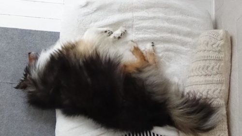 シェットランド・シープドッグという牧羊犬なので、羊の毛に懐かしさを感じるのか、我が家のワンズ2号も気に入っているようです。