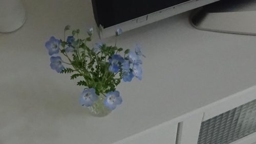 時期的に庭のネモフィラやキャットミントが盛んに咲いているので、切り花にして飾ってみました。