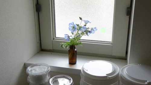 ネモフィラのような小さな花の場合は、スパイスの空き瓶や、風邪のときに飲んだ“新リコリス「ゼンヤク」”の空き瓶などを再利用。