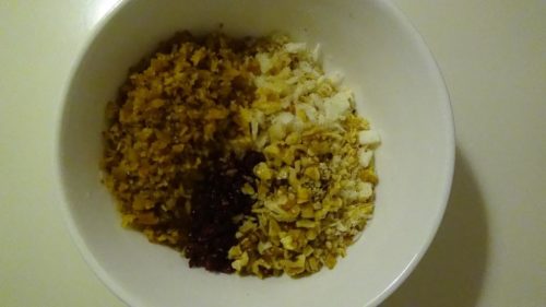 ① 食パンはフードプロセッサーで生パン粉状態にして、バームクーヘン、種をのぞいた梅、クランベリー、くるみは包丁で刻んでおきます。