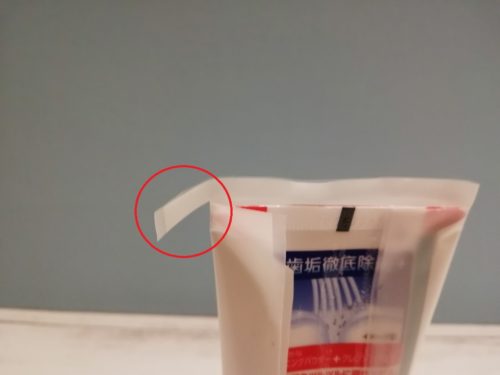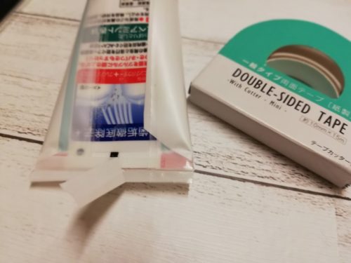 クリアバッグの両端に両面テープを貼って、歯磨き粉をクルリと包みます。