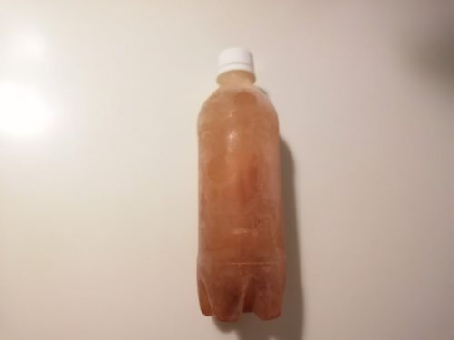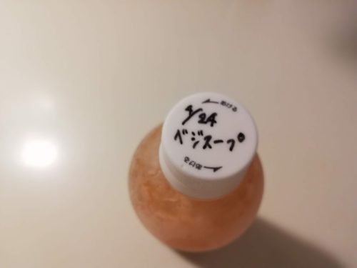 出来上がったベジブロスは、炭酸水のペットボトルに入れて冷凍ストック。