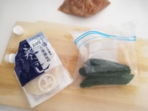 野菜室に残っていたキュウリ1.5本は寒こうじ漬けに。