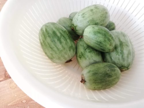 キュウリは寒こうじ漬けにするので、同じウリ科のチビッコメロンは辛子漬けにします。